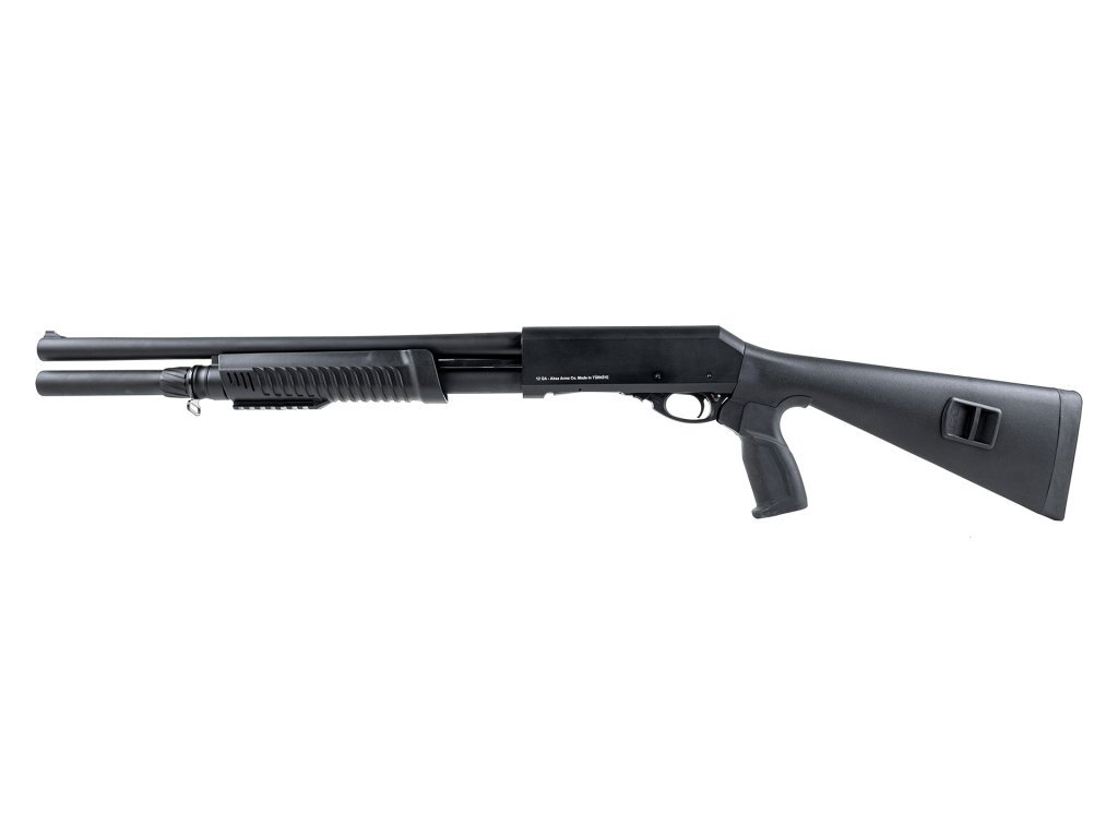 Taktická opakovací brokovnice s 11" hlavní v ráži 12/76. Je vybavena výsuvnou pažbou, světlovodnými mířidly a úsťovou brzdou. Díky...