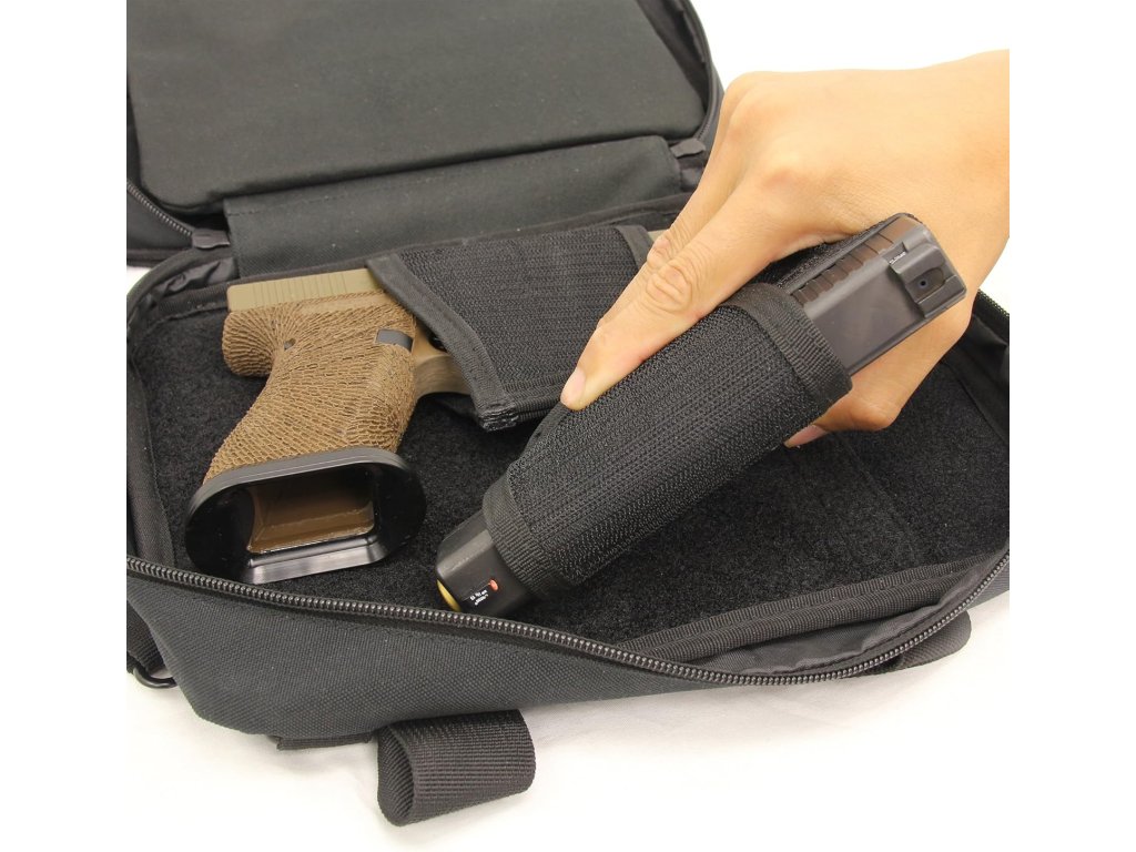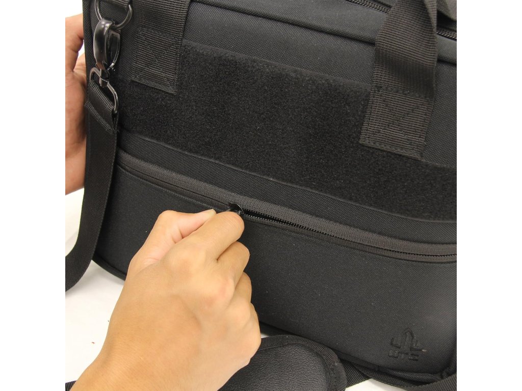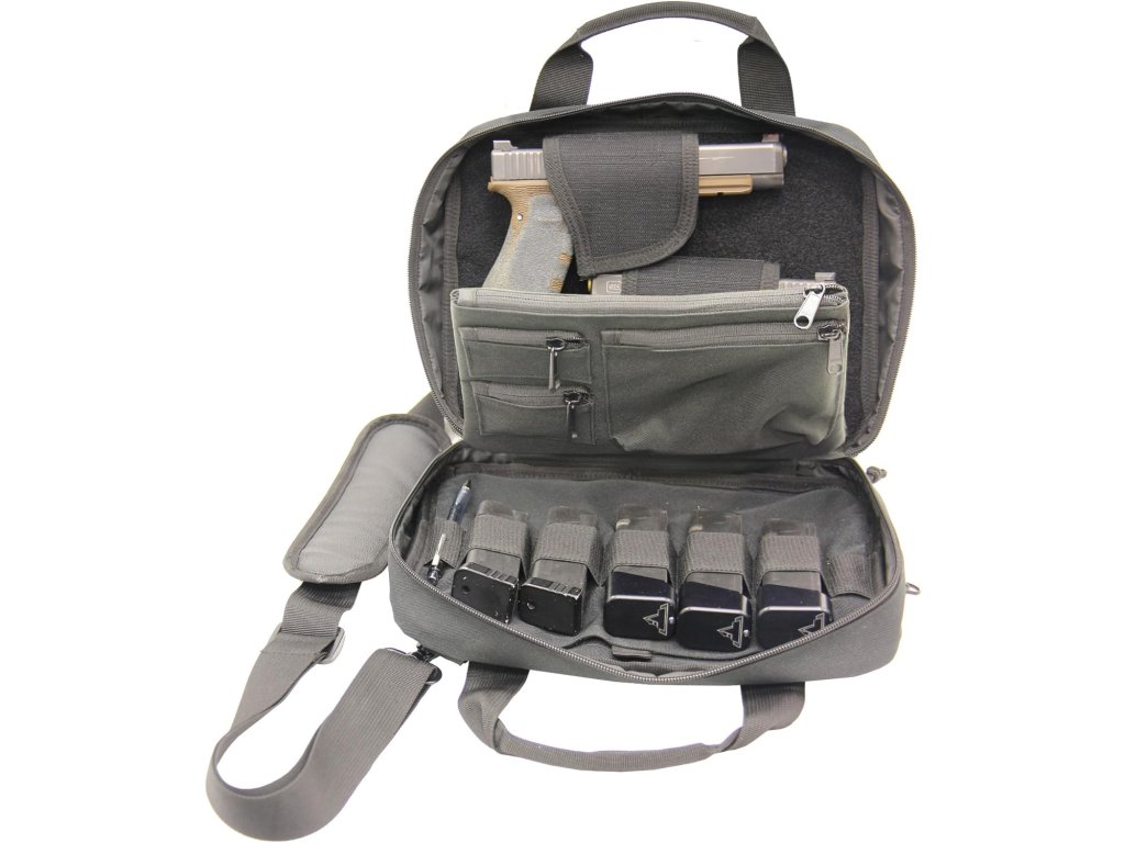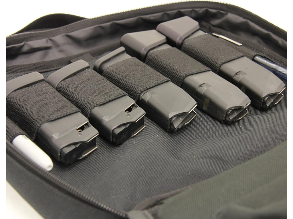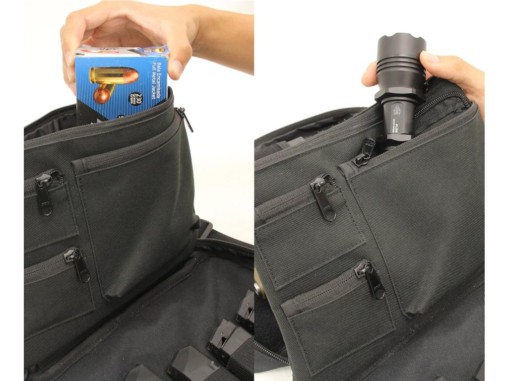 Praktická taška pro dvě pistole (velikost Compact – Full-Size) s bohatým prostorem na další příslušenství.