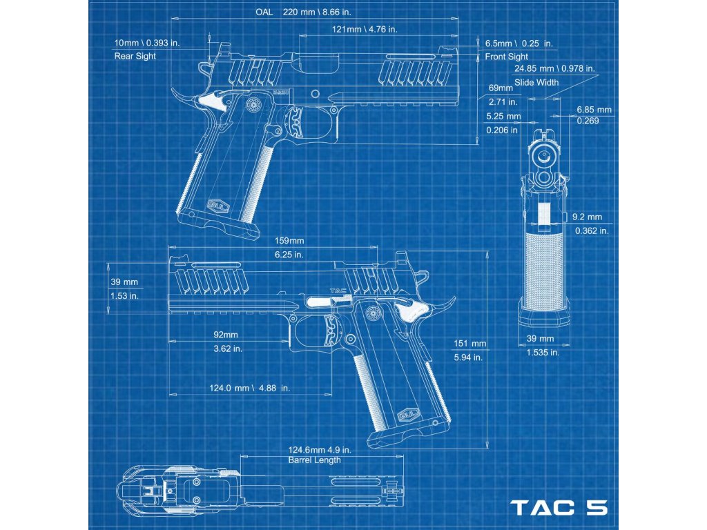 Hlaveň s nerezovým povrchem má délku 5" (125 mm). Skeletizovaná spoušť se vyznačuje odporem až 3,2 lbs (1,45 kg). Zbraň se dodává se 4 zásobníky s kapacitou na 20 ran.