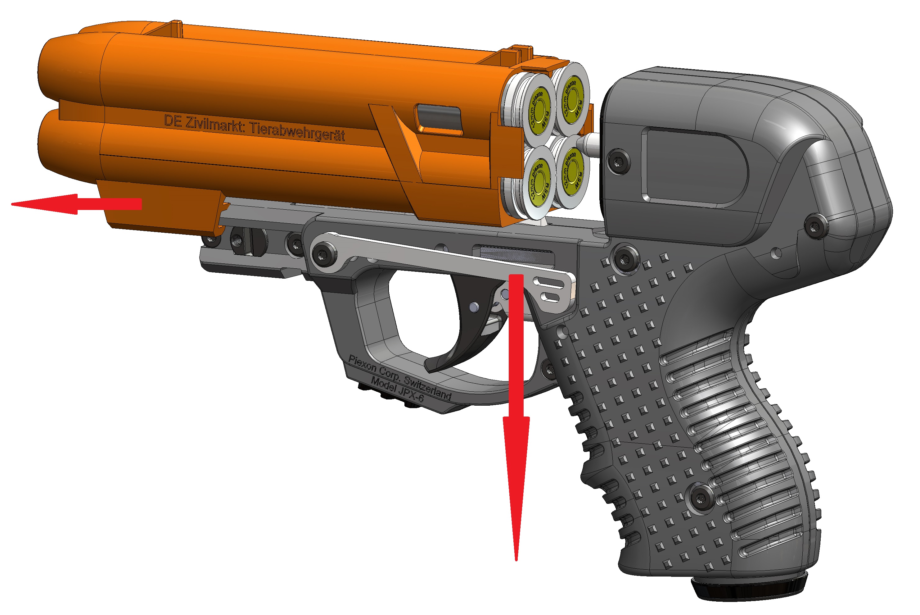 JPX6 Jet Defender se skládá z rámu a zásobníku. Obě tyto části jsou vyrobeny z odolného polymeru, proto jsou odolné vůči nárazu i vlhkosti. Rám se skládá z pažbičky, bicího mechanismu, spouště a vodící kolejničky, na kterou se upevní zásobník se 4 nábojkami. Při nabíjení zásobník pomocí oboustranné páčky uvolníte a nasunete. JPX6 Jet Defender Laser dále nabízí Picatinny rail, na který můžete přidat příslušenství např. taktickou svítilnu.