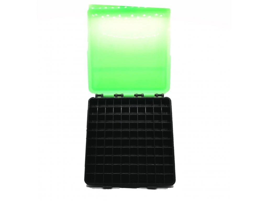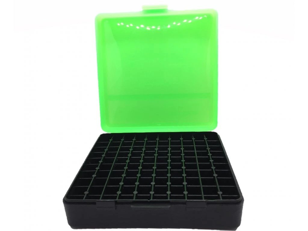 Uzavíratelná krabička pro 100 ks nábojů pistolových ráží (6,35 mm Browning – 9 mm Luger). Spodní a vrchní díl je oddělitelný.