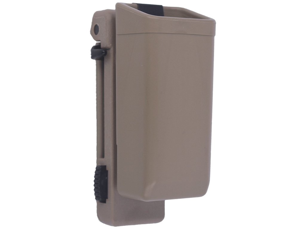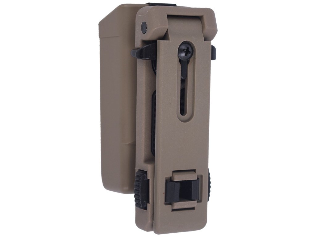Pouzdro je možné vůči opasku otočit v rozsahu 360° v celkem 16 aretovaných polohách. Nechybí ani možnost připojení na nosný systém MOLLE.