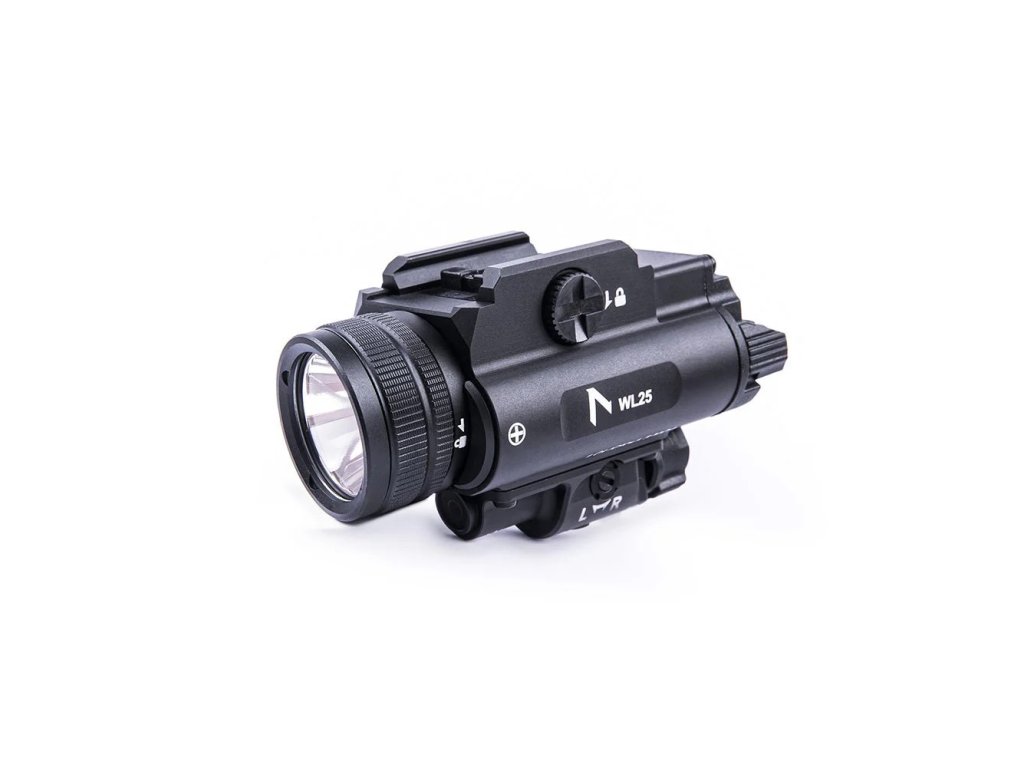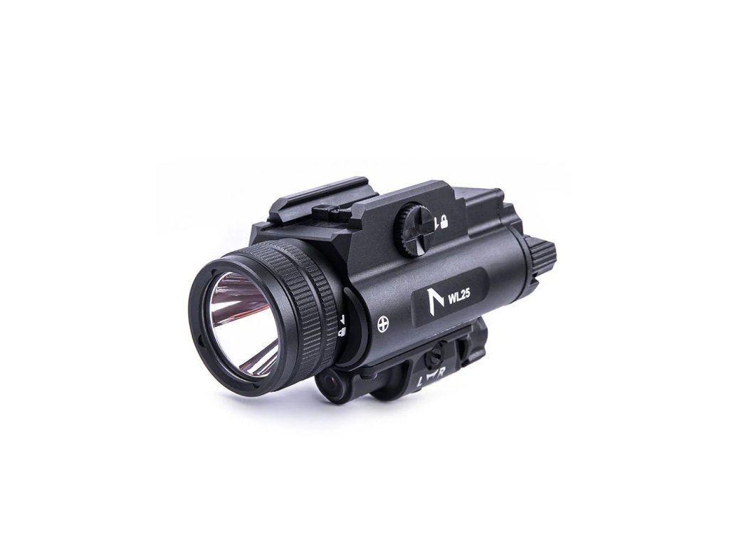NEXDOT WL25 je profesionální taktická svítilna na zbraň s integrovaným zeleným laserem, navržená pro rychlou a přesnou akvizici cíle v nízké viditelnosti. Nabízí výkon až 1 200 lumenů, intenzitu 44 100 candela a dosah paprsku 420 metrů. Kompaktní tělo kombinuje výkonné bílé světlo a přesný zelený laser ≤5 mW v odolném provedení připraveném pro služební i obranné použití.