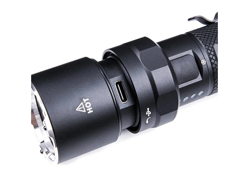 Robustní konstrukce z leteckého hliníku s tvrdým eloxováním je odolná proti nárazům i vodě (IPX7, pád z výšky do 2 m). Skrytý USB-C port nenarušuje taktické linie svítilny a umožňuje pohodlné a bezpečné dobíjení.