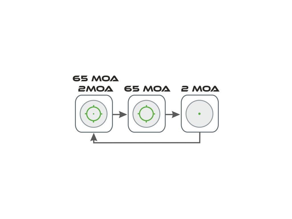 - Obrazec + tečka: 65 MOA + 2 MOA